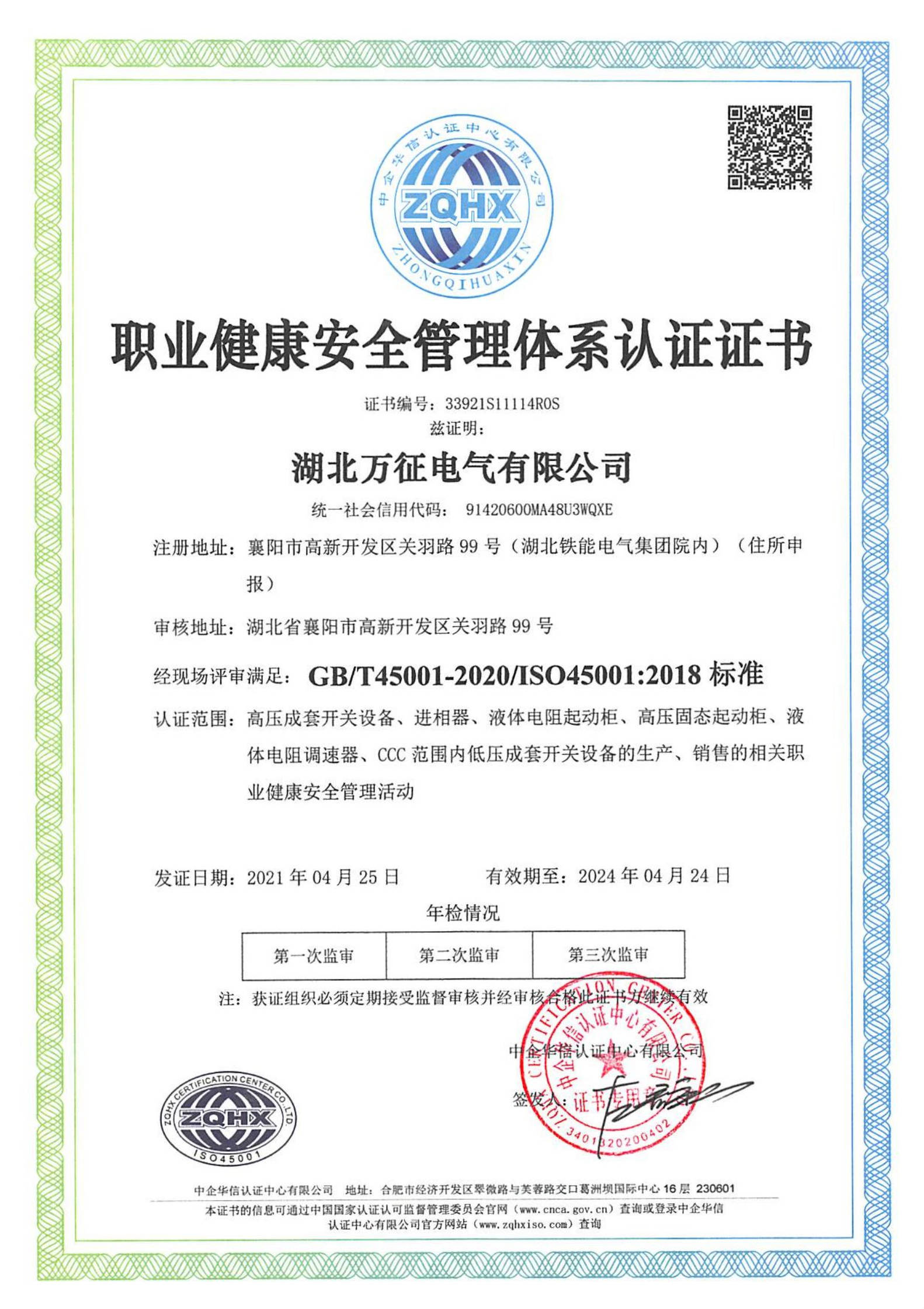 日前,中企華信認(rèn)證中心向湖北萬征電氣有限公司頒發(fā)了質(zhì)量管理體系認(rèn)證證書、環(huán)境管理體系認(rèn)證證書以及職業(yè)健康安全管理體系認(rèn)證證書,這是湖北萬征電氣有限公司分別按GB/T19001-2016-ISO9001:2015、GB/T24001-2016-ISO14001:2015及GB/T45001-2020-ISO45001:2018標(biāo)準(zhǔn)要求進(jìn)行的換證認(rèn)證。本次質(zhì)量管理體系覆蓋的范圍包括:高壓成套開關(guān)設(shè)備、進(jìn)相器、液體電阻起動(dòng)柜、高壓固態(tài)軟起動(dòng)柜、液體電阻調(diào)速器、CCC范圍內(nèi)低壓成套開關(guān)設(shè)備的生產(chǎn)與銷售。